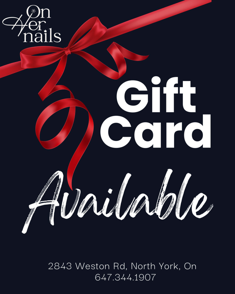 Regala un tocco di eleganza. La Gift Card On Her Nails è valida per tutti i servizi—manicure, pedicure, Gel-X/BIAB, ciglia, ceretta—e chi la riceve può prenotare quando preferisce. Spazio boutique, pulito e sicuro, su Weston Rd. Usa una gift card fisica—perfetta per un regalo di persona nel nostro salone.